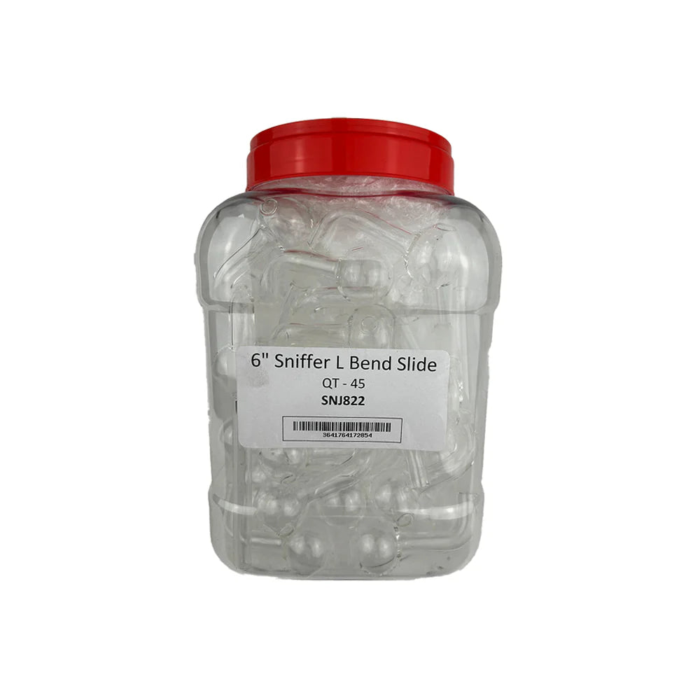Stock your shop with the Glass 6 Inch Sniffer L Bend Oil Burner – 45 Piece Jar, a reliable and affordable glass pipe ideal for resale. Designed with an ergonomic L bend and made from heat-resistant glass, this 6-inch burner provides a smooth and direct experience. It’s a must-have for any head shop or smoke shop’s wholesale inventory.