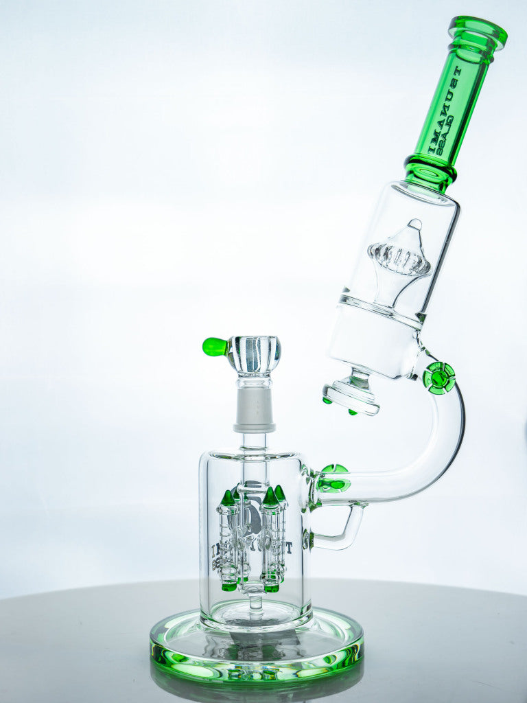 The Tsunami 14” Microscope Water Pipe delivers both form and function, blending a scientific microscope-style frame with Quad Rocket Domed Percolators for exceptional smoke diffusion. This unique silhouette not only turns heads—it cools and filters smoke for a smoother, cleaner hit every time.